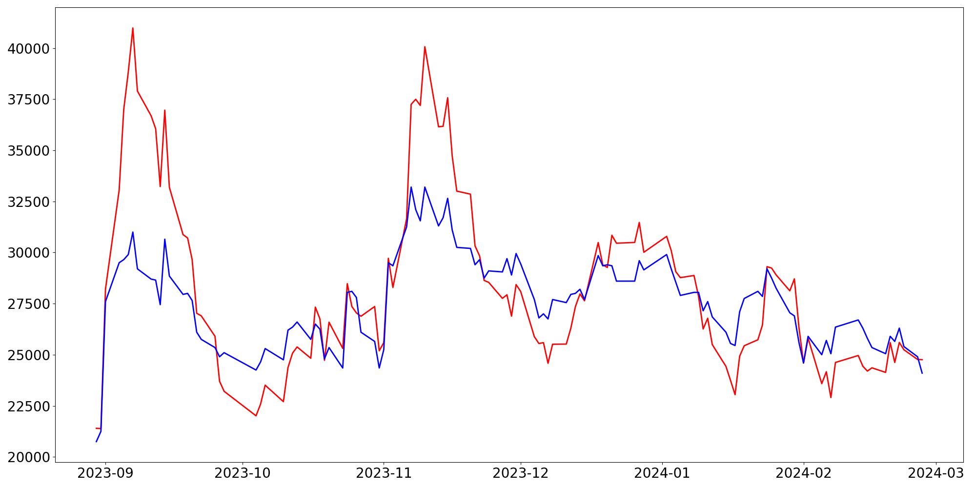[ - : 실제값(종가) / - : 예측값(종가) ]