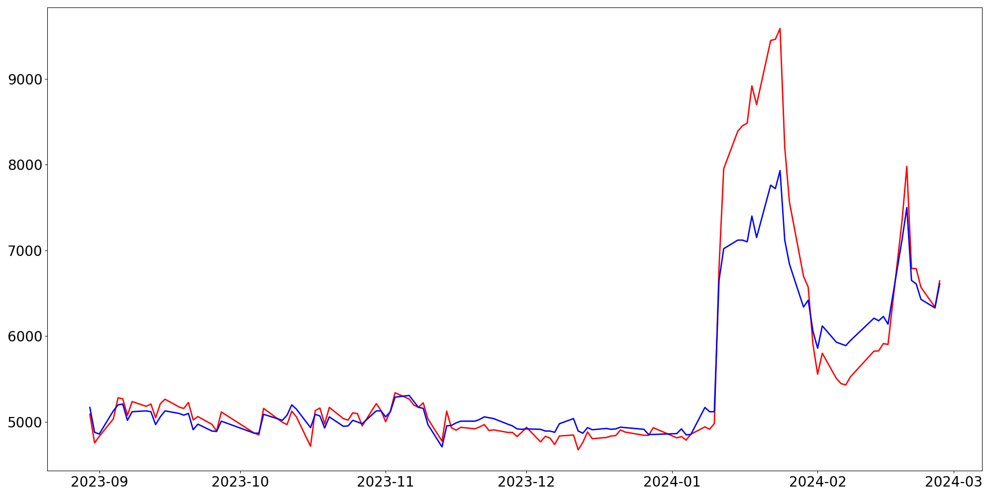 [ - : 실제값(종가) / - : 예측값(종가) ]
