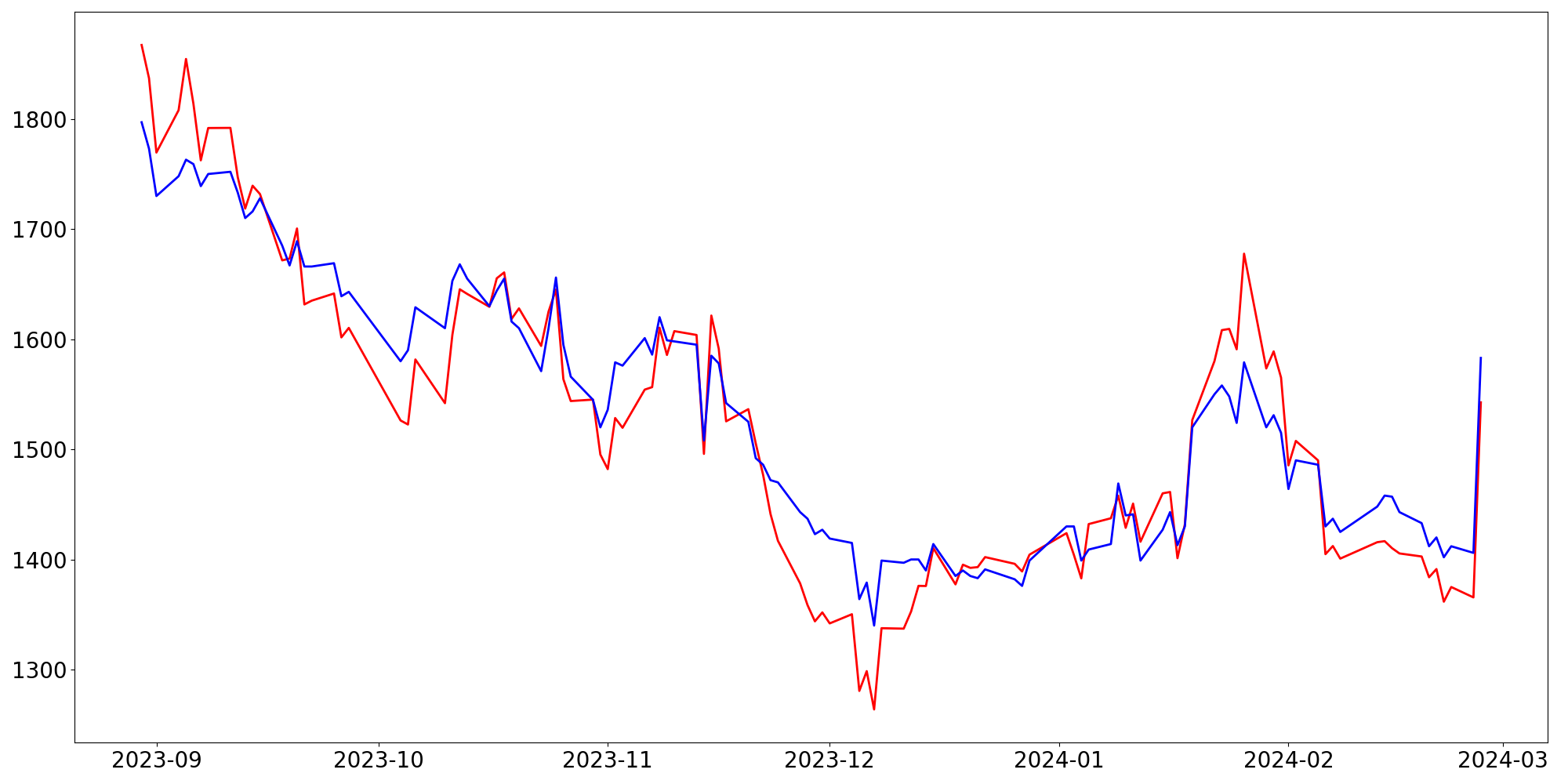 [ - : 실제값(종가) / - : 예측값(종가) ]
