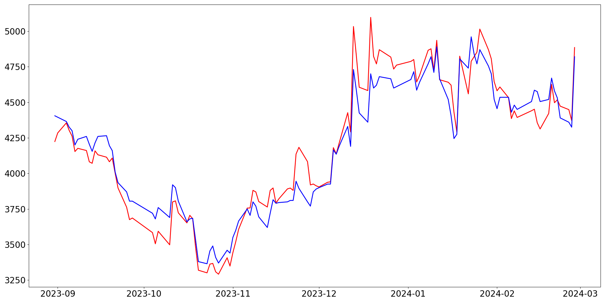 [ - : 실제값(종가) / - : 예측값(종가) ]