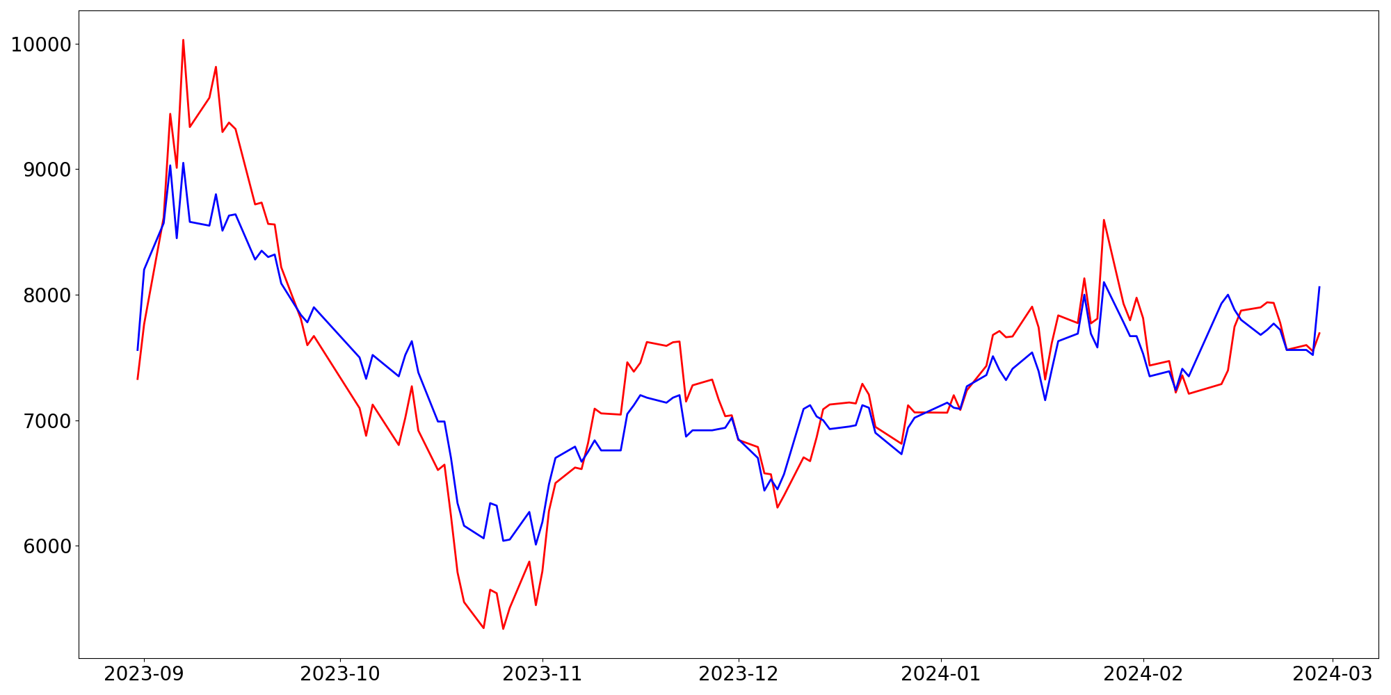 [ - : 실제값(종가) / - : 예측값(종가) ]
