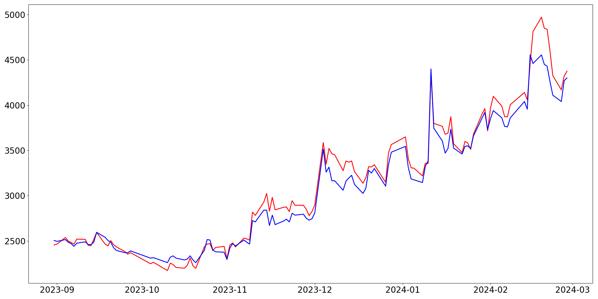 [ - : 실제값(종가) / - : 예측값(종가) ]