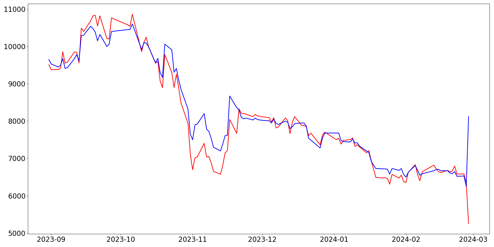 [ - : 실제값(종가) / - : 예측값(종가) ]