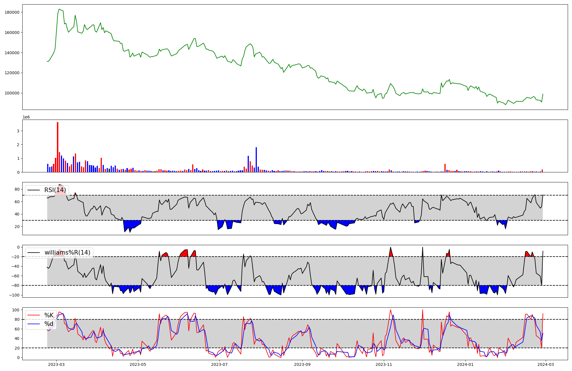 □ 중기 : 현재 종가가 중기(60일) 이동평균값(99,312원)을 하회 하여 중기적 추세 하락 중