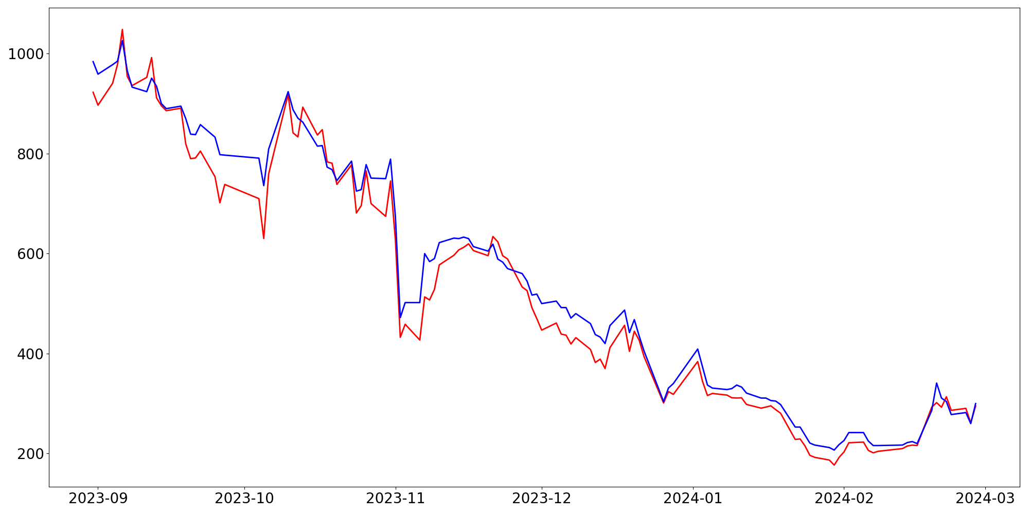 [ - : 실제값(종가) / - : 예측값(종가) ]