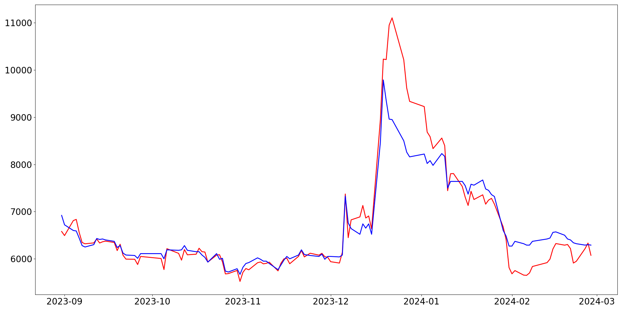 [ - : 실제값(종가) / - : 예측값(종가) ]