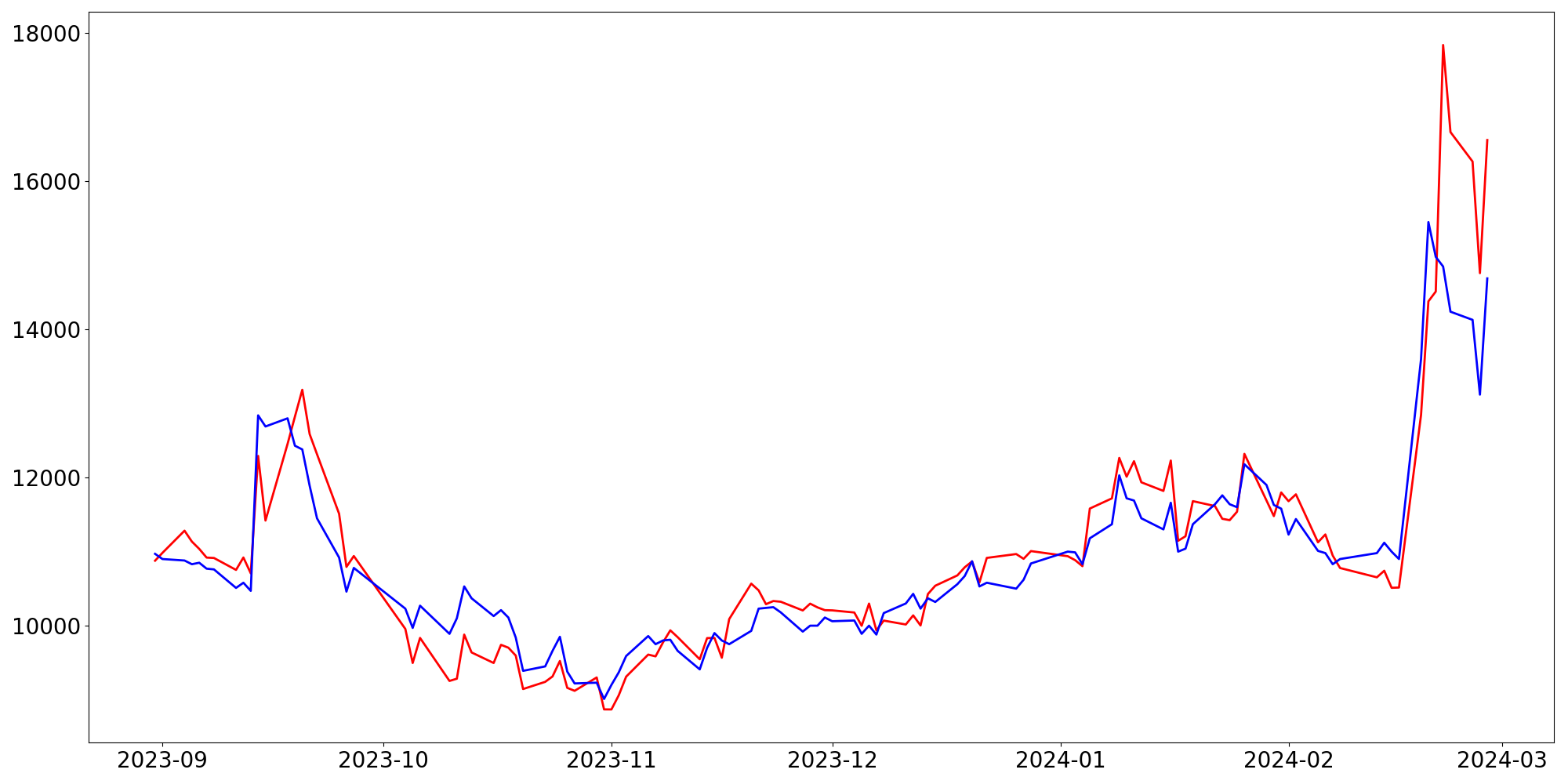 [ - : 실제값(종가) / - : 예측값(종가) ]