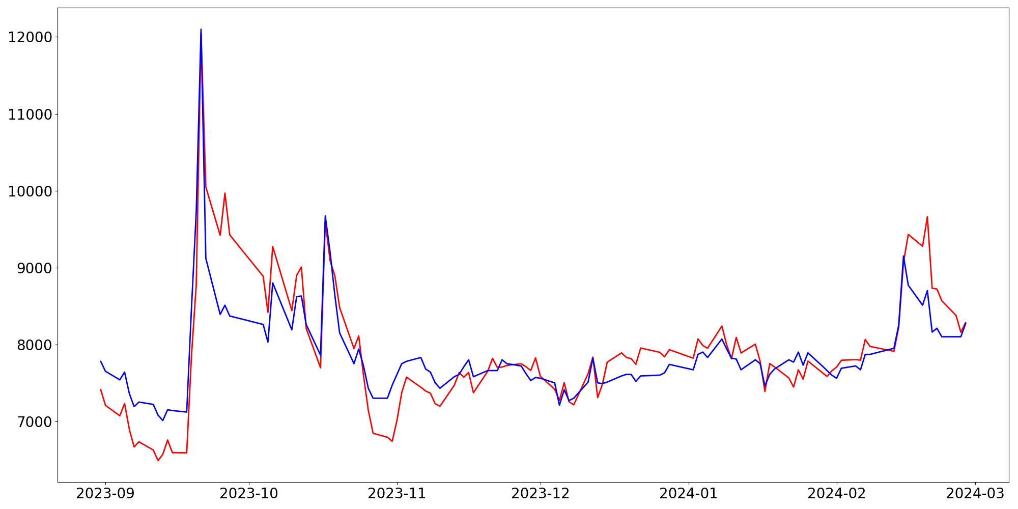 [ - : 실제값(종가) / - : 예측값(종가) ]