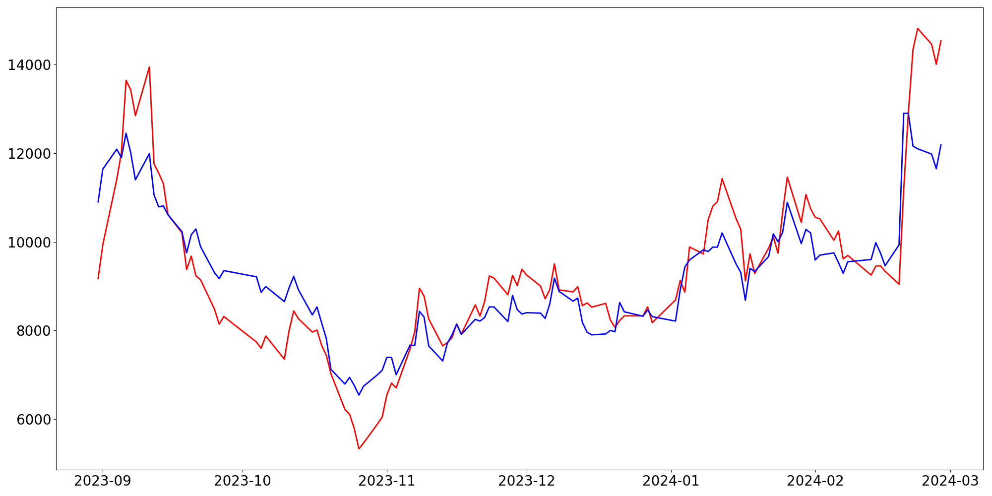 [ - : 실제값(종가) / - : 예측값(종가) ]
