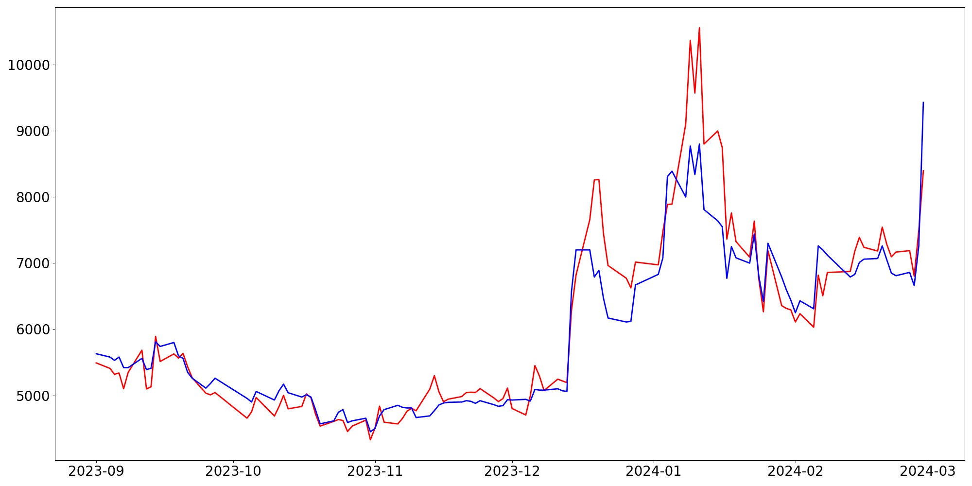 [ - : 실제값(종가) / - : 예측값(종가) ]