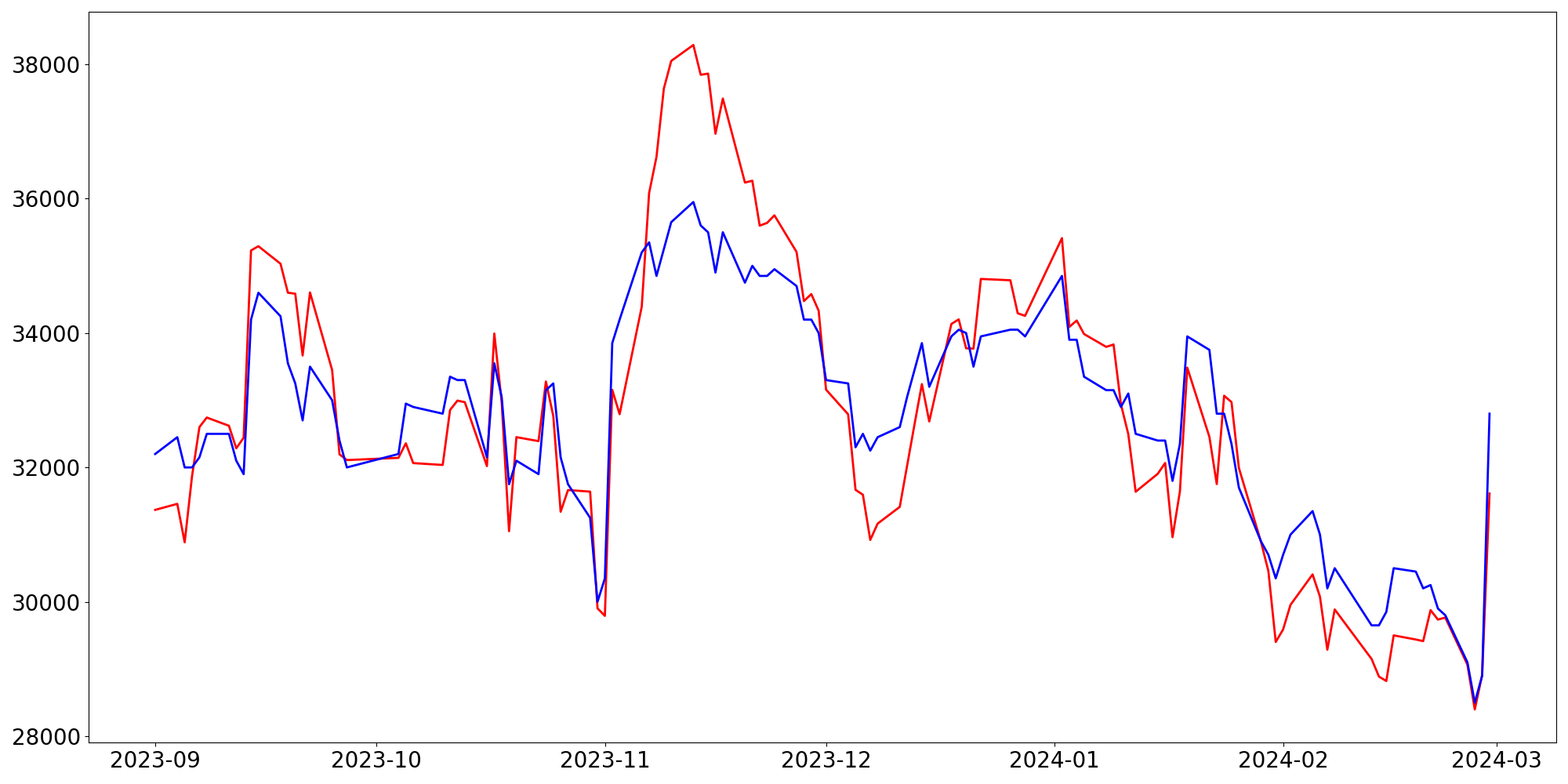 [ - : 실제값(종가) / - : 예측값(종가) ]