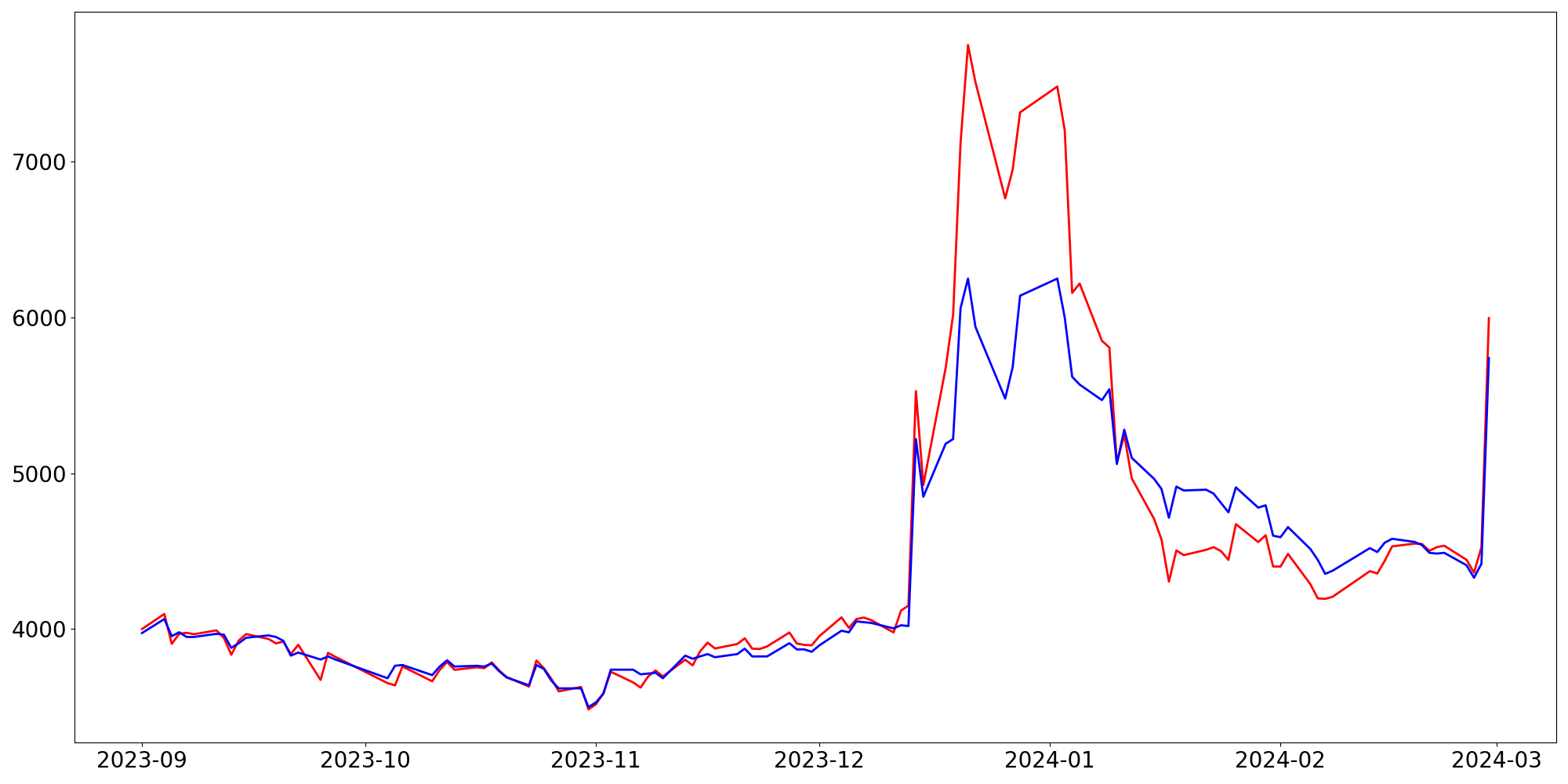 [ - : 실제값(종가) / - : 예측값(종가) ]