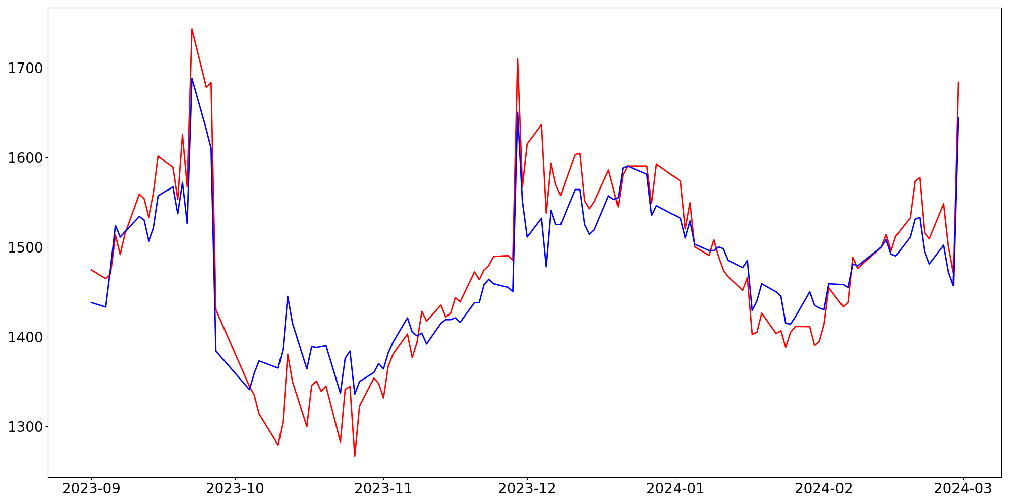 [ - : 실제값(종가) / - : 예측값(종가) ]