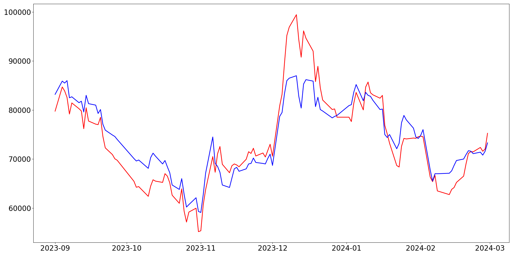[ - : 실제값(종가) / - : 예측값(종가) ]