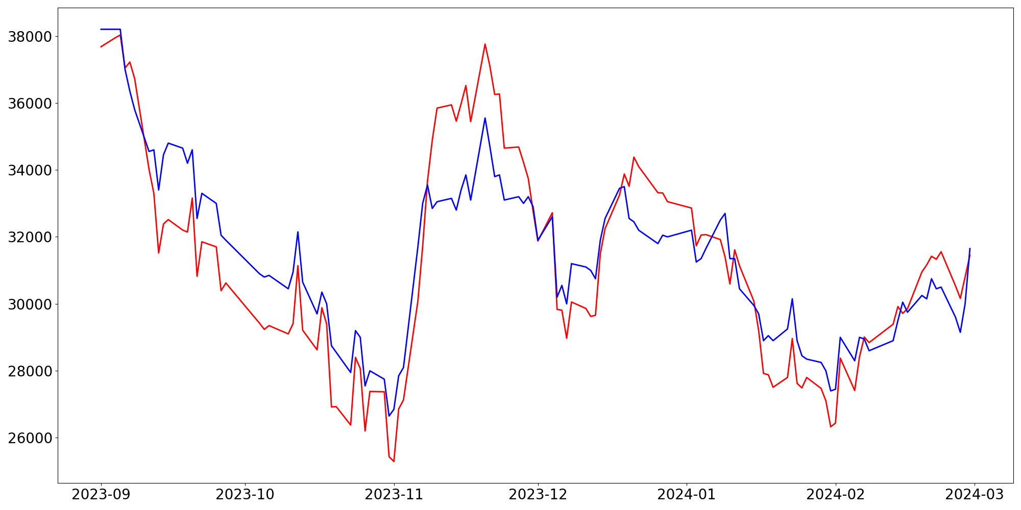 [ - : 실제값(종가) / - : 예측값(종가) ]