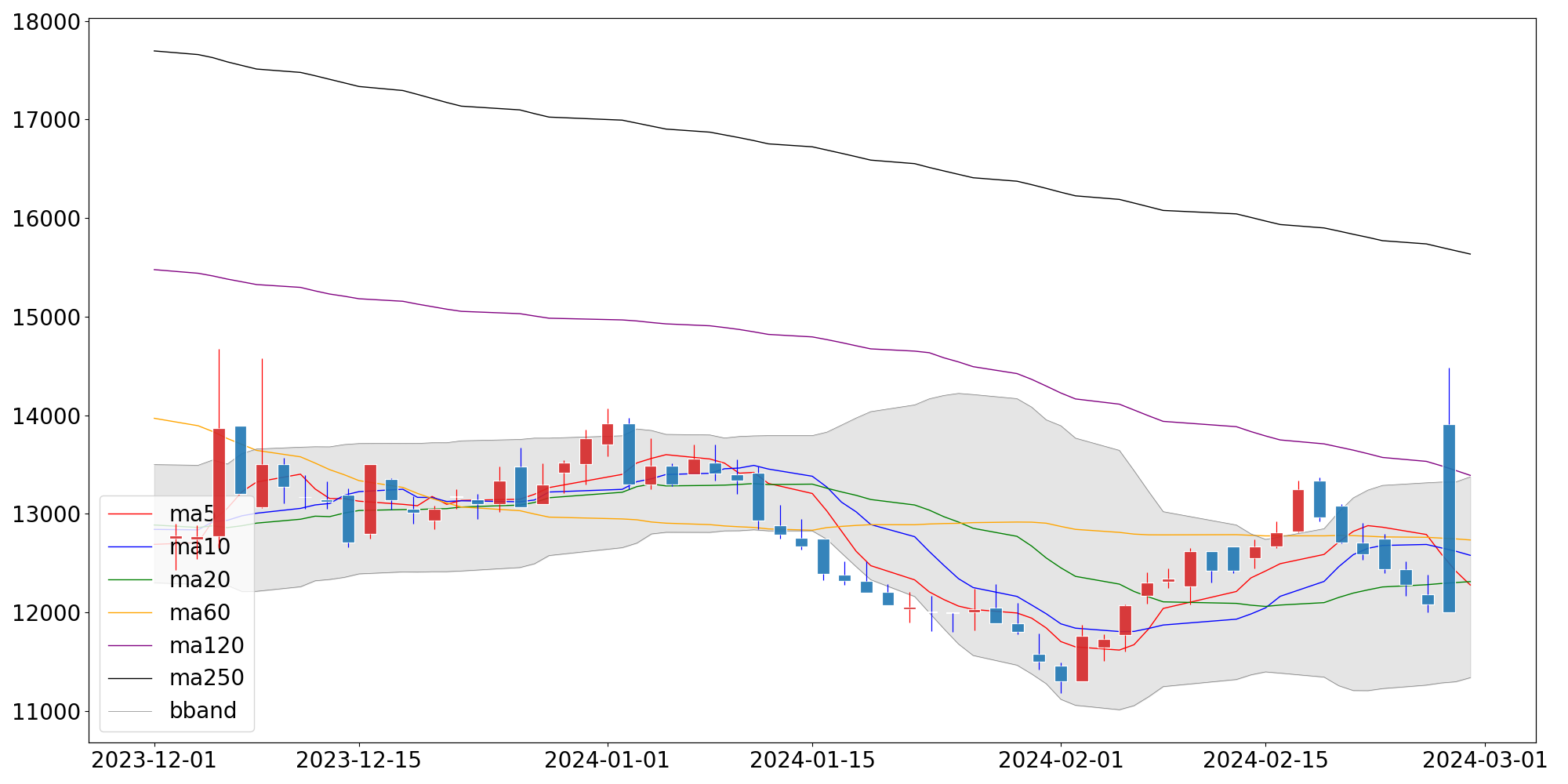 □ 중기 : 현재 종가가 중기(60일) 이동평균값(12,735원)을 하회 하여 중기적 추세 하락 중