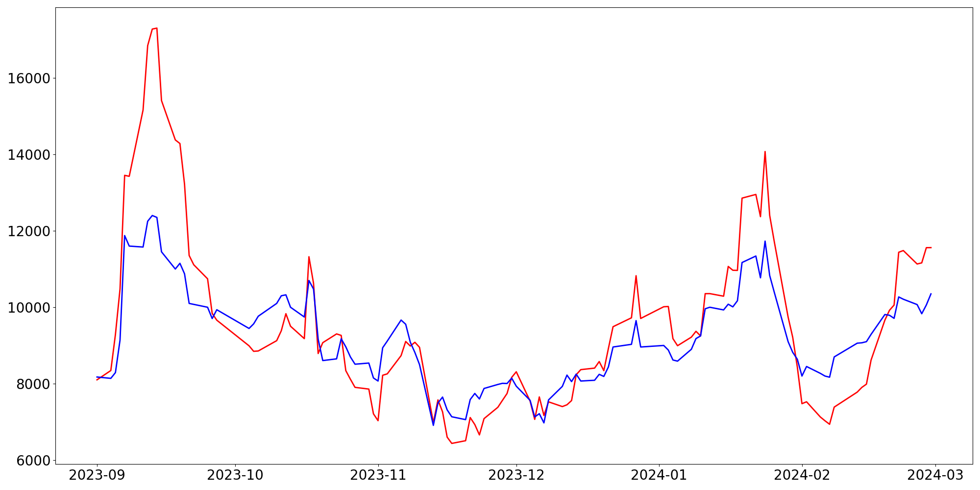 [ - : 실제값(종가) / - : 예측값(종가) ]