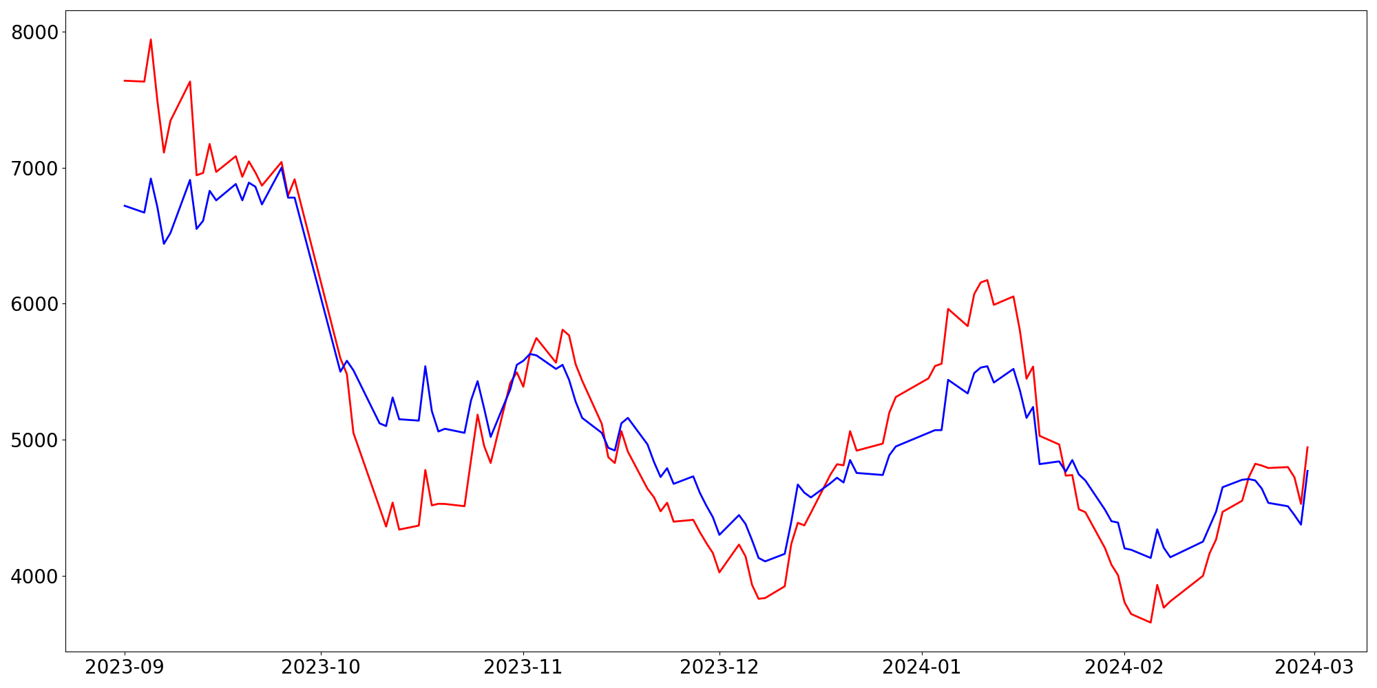 [ - : 실제값(종가) / - : 예측값(종가) ]