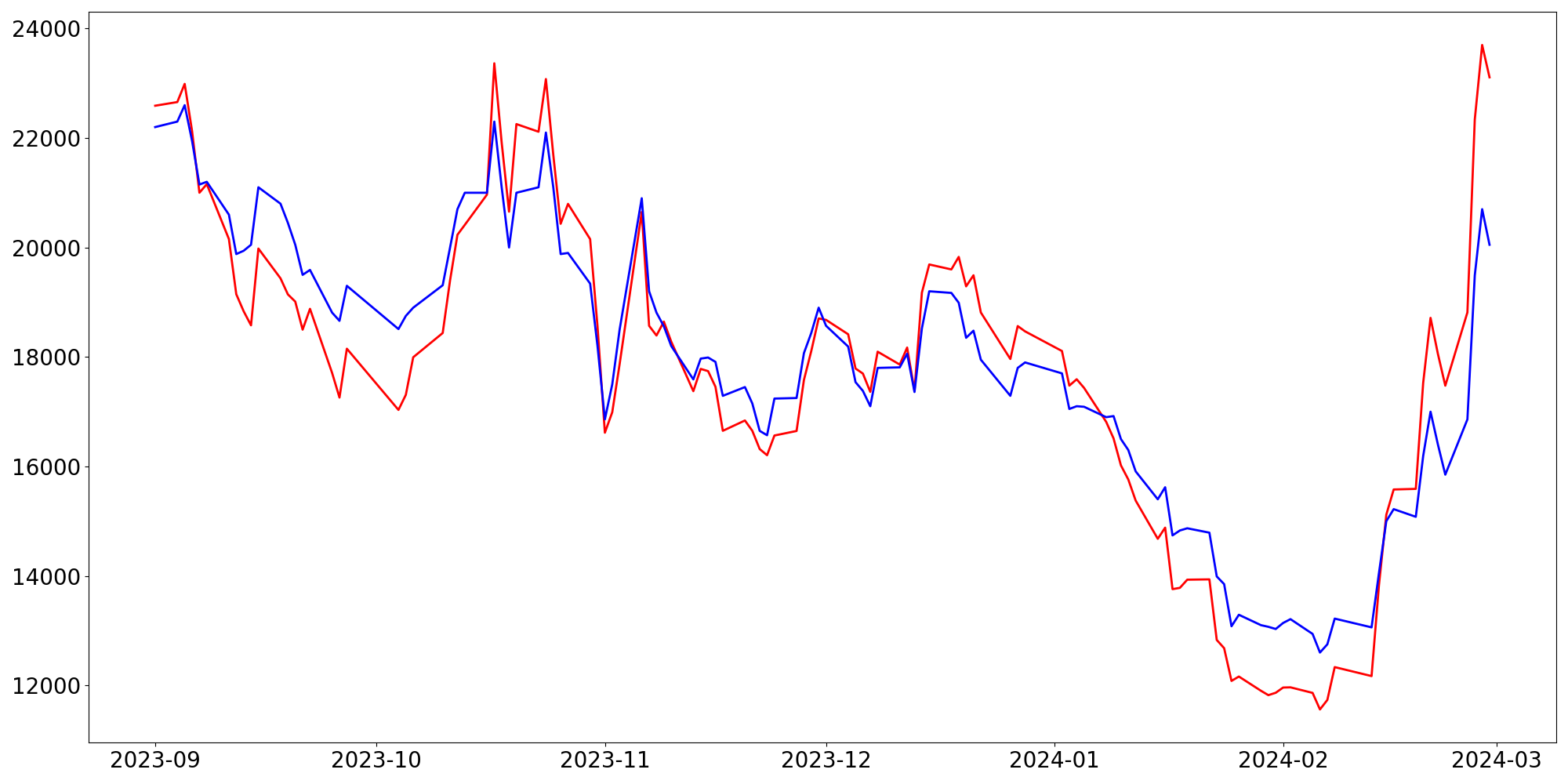 [ - : 실제값(종가) / - : 예측값(종가) ]