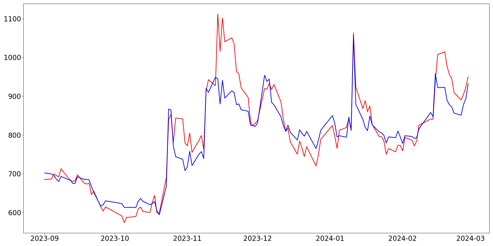 [ - : 실제값(종가) / - : 예측값(종가) ]