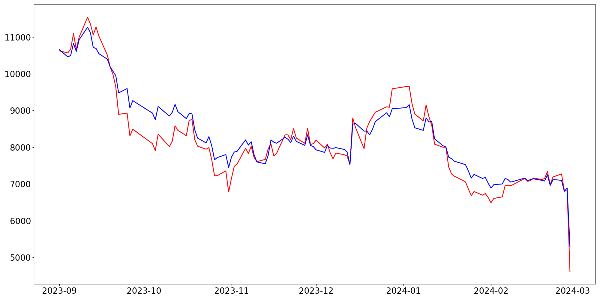 [ - : 실제값(종가) / - : 예측값(종가) ]