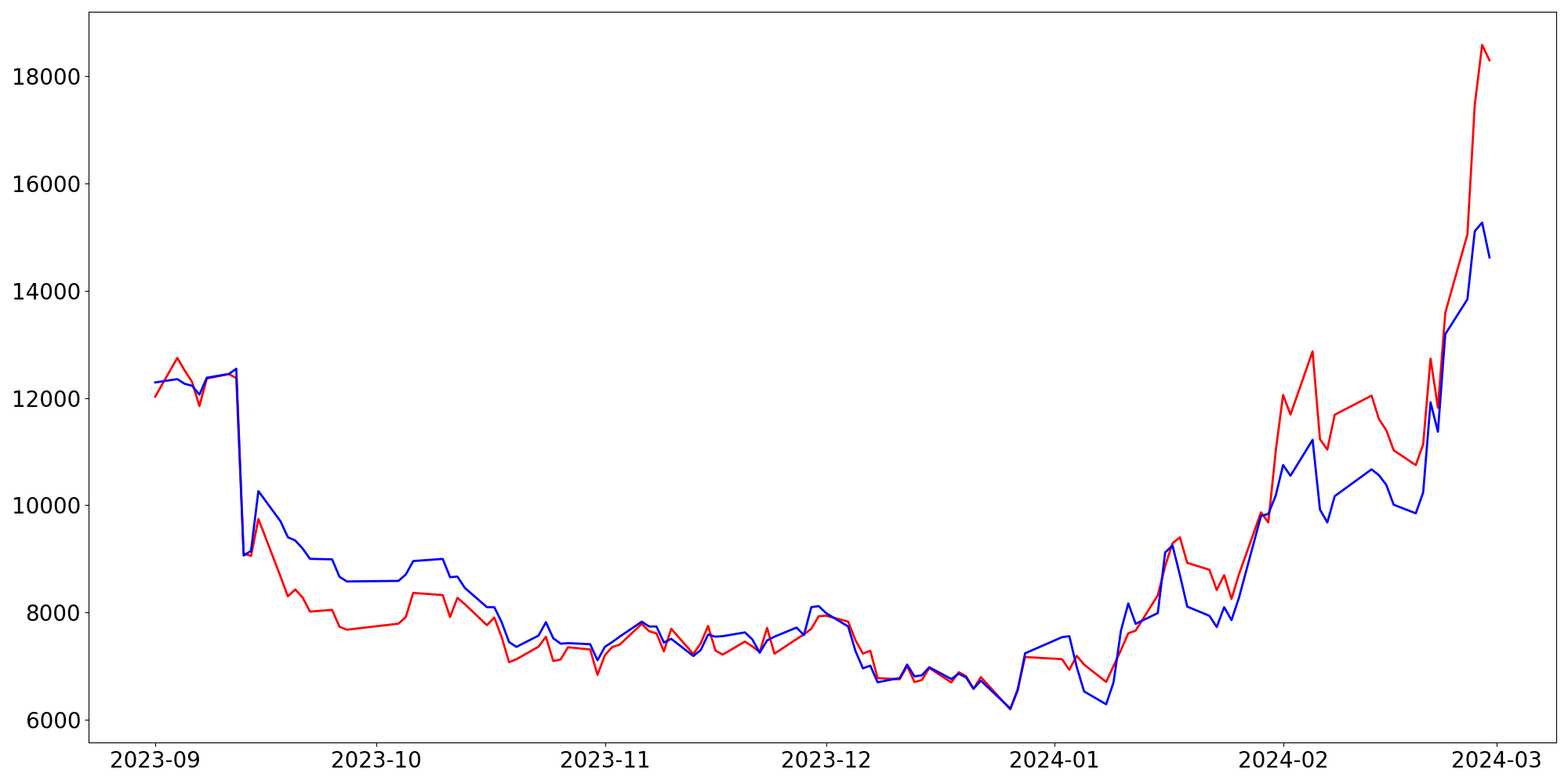 [ - : 실제값(종가) / - : 예측값(종가) ]