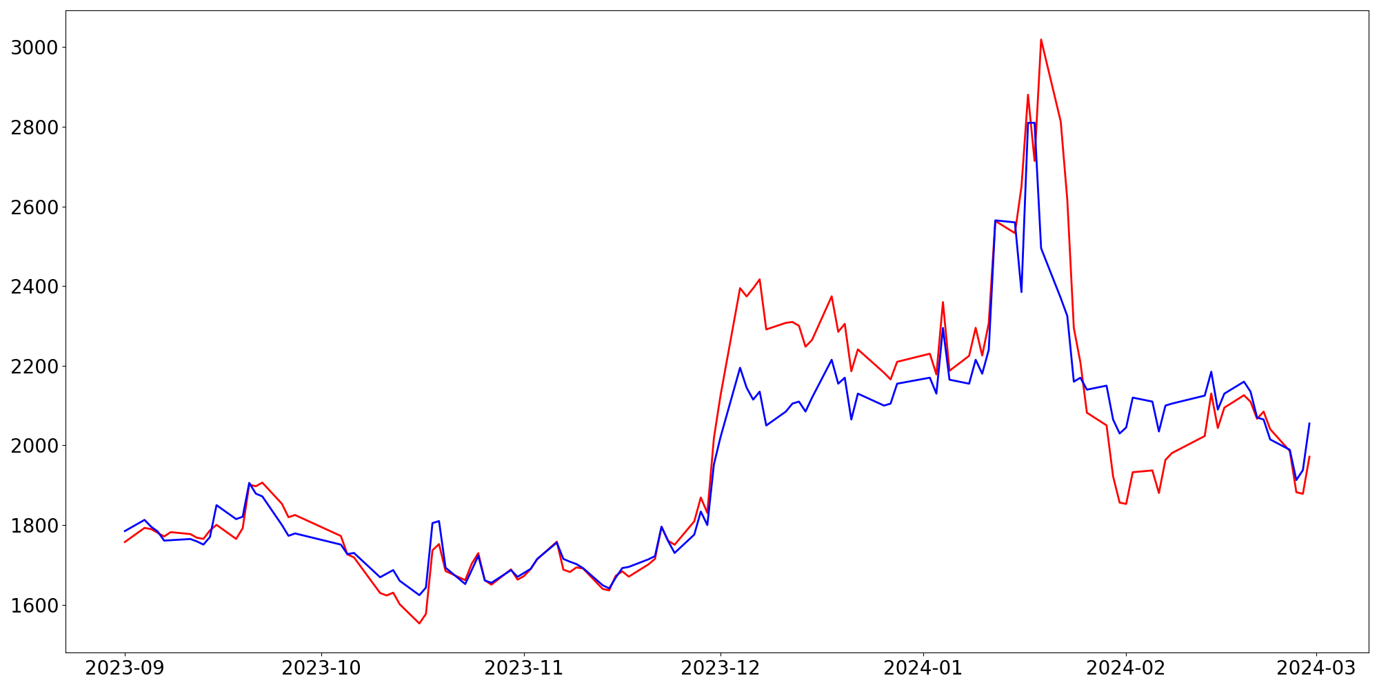[ - : 실제값(종가) / - : 예측값(종가) ]