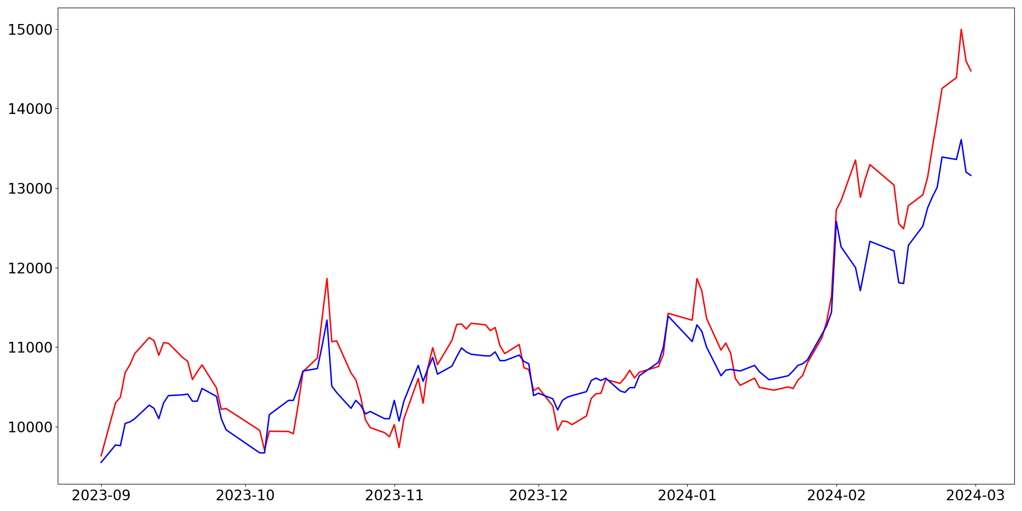 [ - : 실제값(종가) / - : 예측값(종가) ]