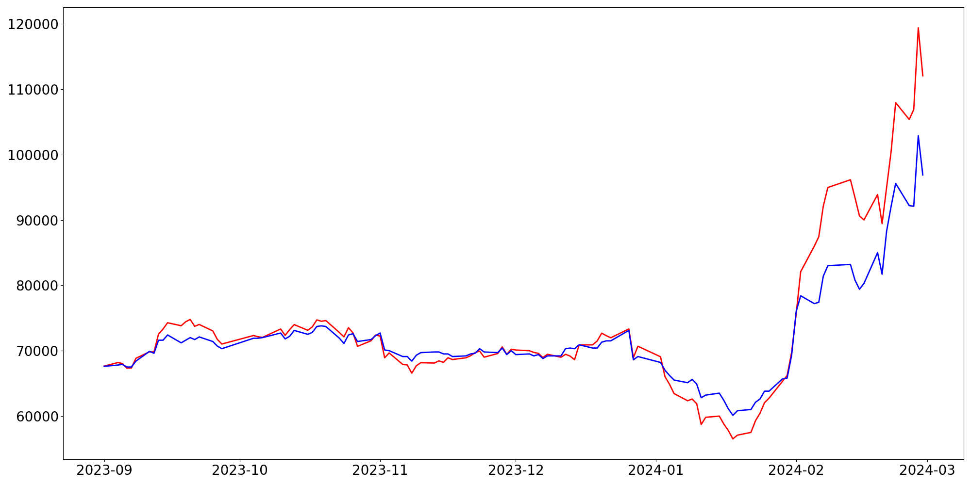 [ - : 실제값(종가) / - : 예측값(종가) ]
