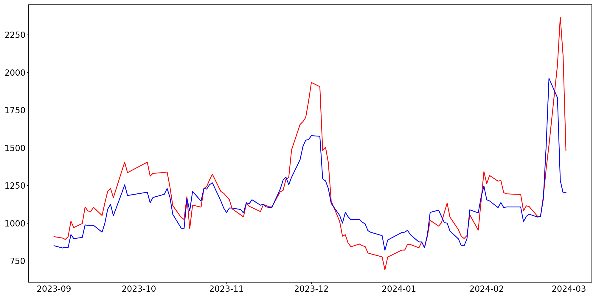[ - : 실제값(종가) / - : 예측값(종가) ]