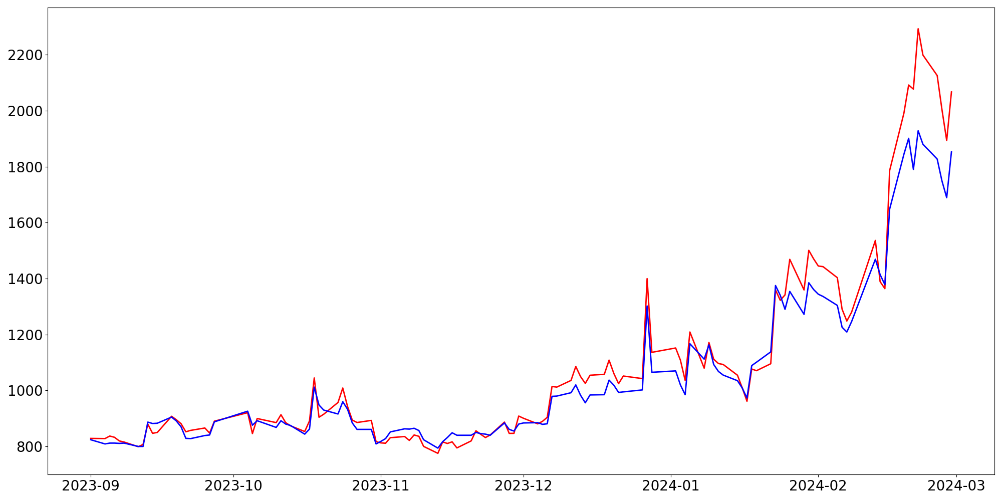 [ - : 실제값(종가) / - : 예측값(종가) ]