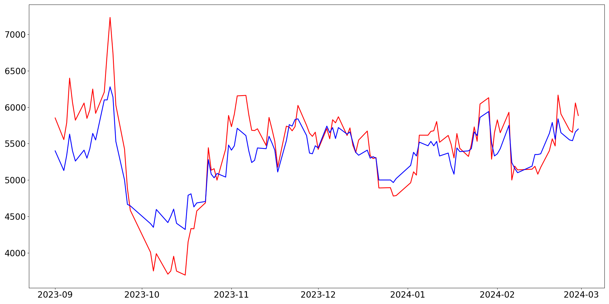 [ - : 실제값(종가) / - : 예측값(종가) ]