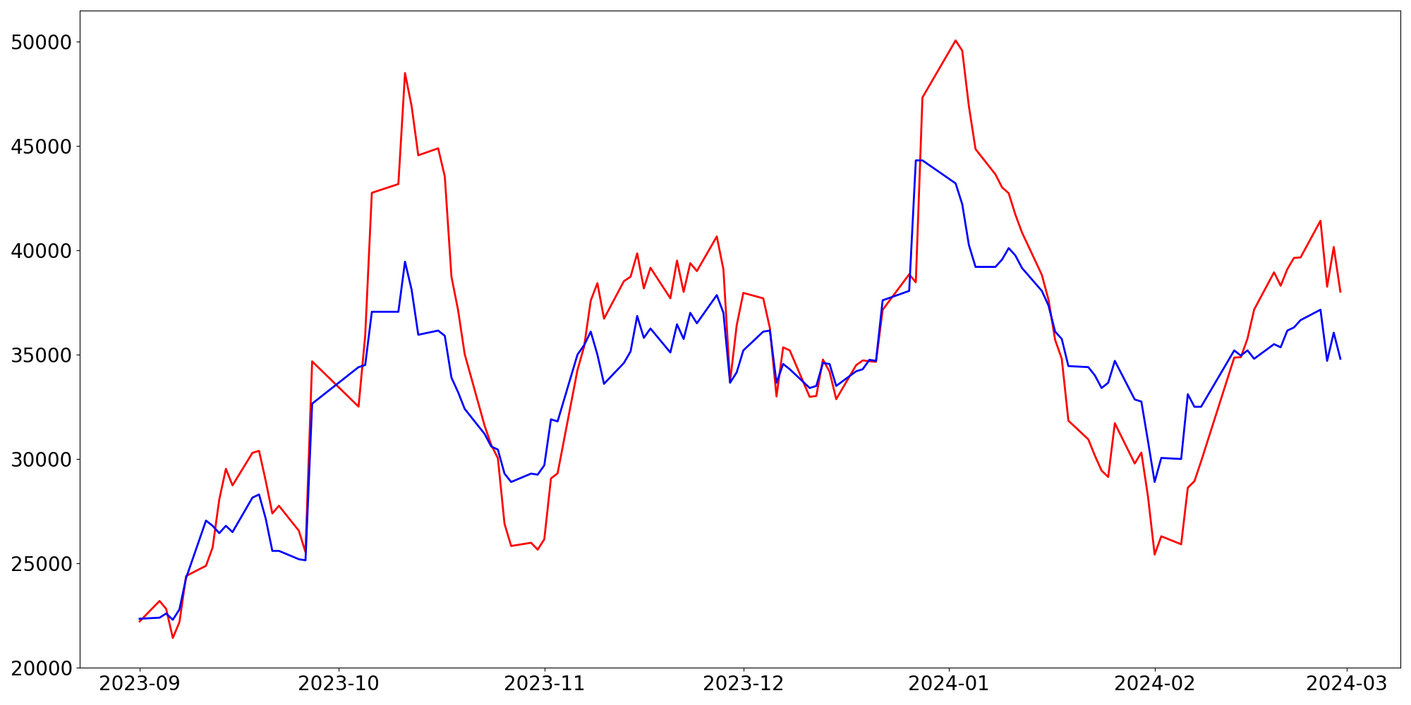 [ - : 실제값(종가) / - : 예측값(종가) ]