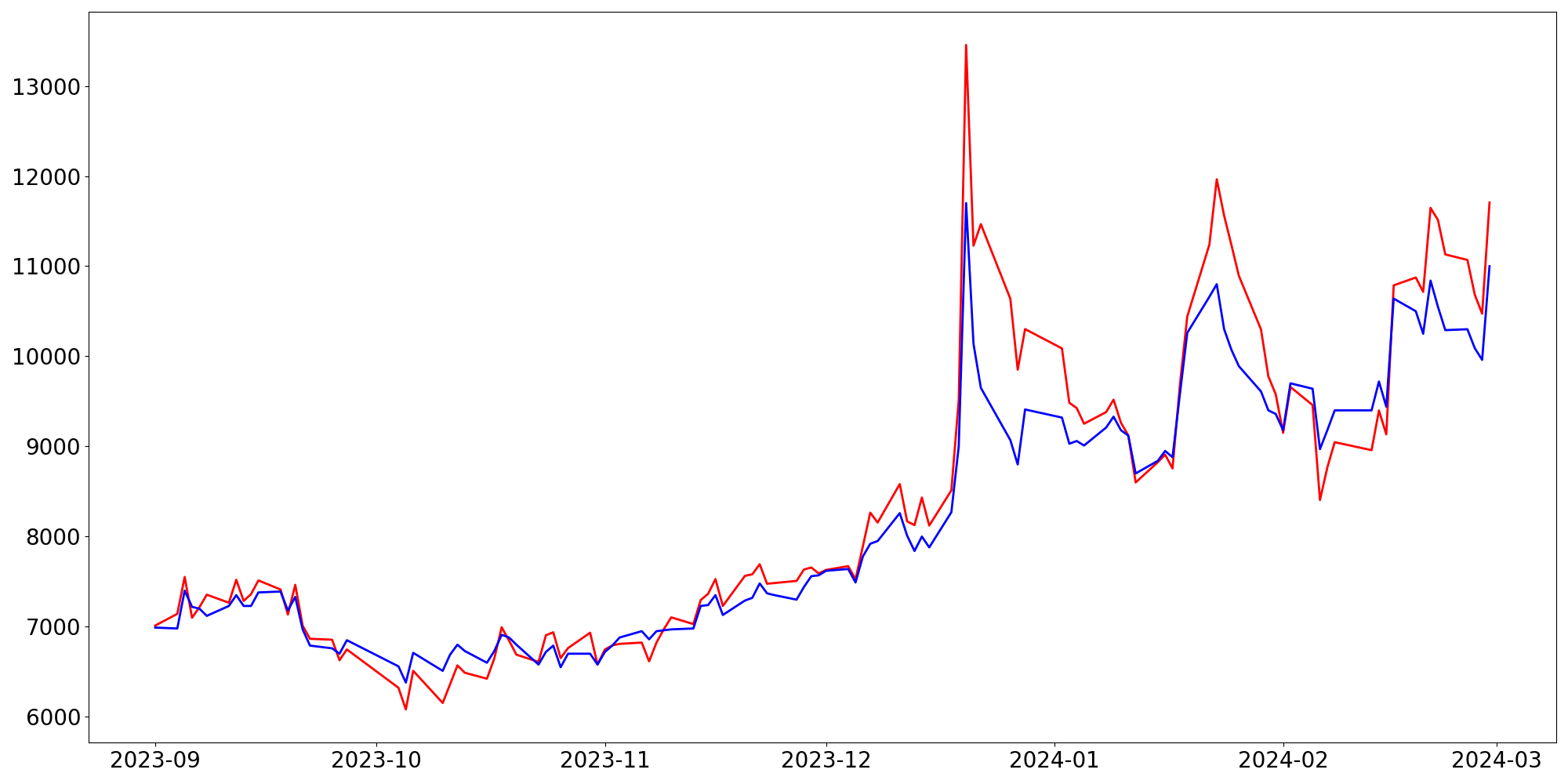 [ - : 실제값(종가) / - : 예측값(종가) ]