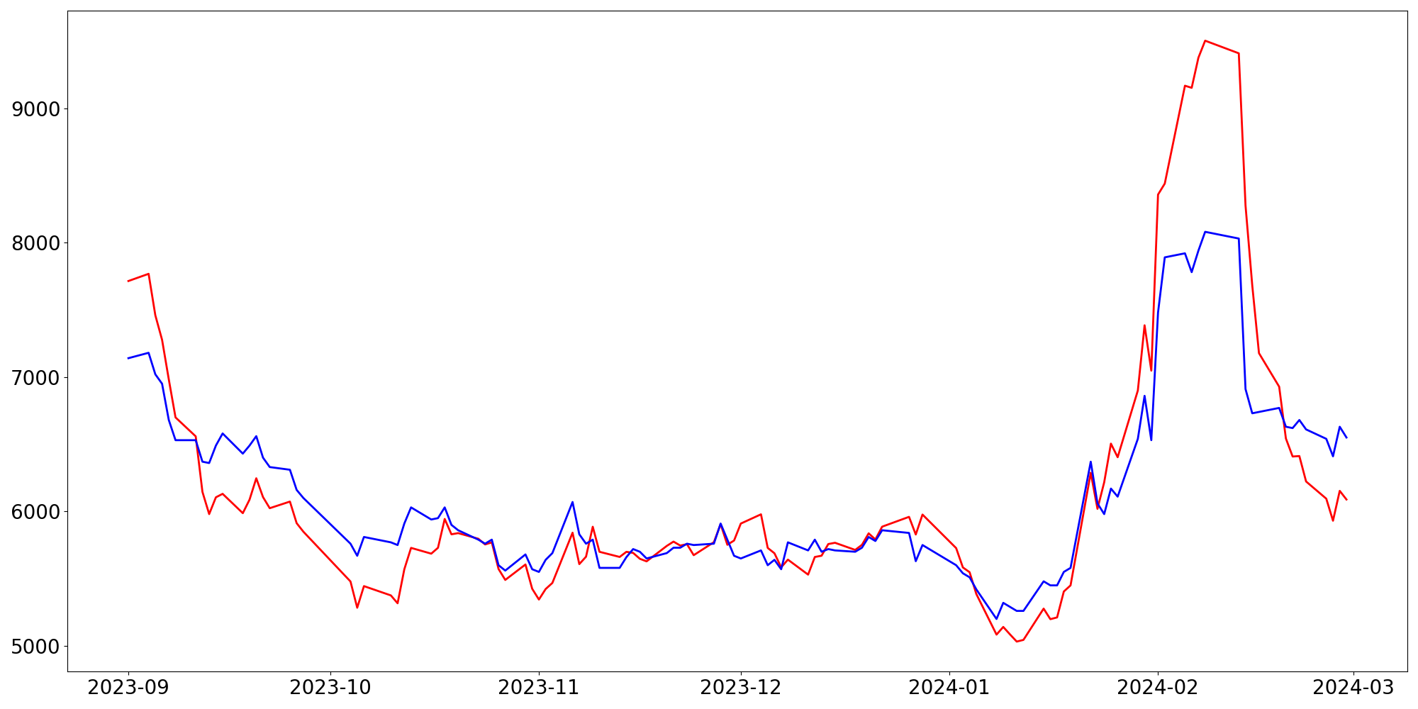 [ - : 실제값(종가) / - : 예측값(종가) ]