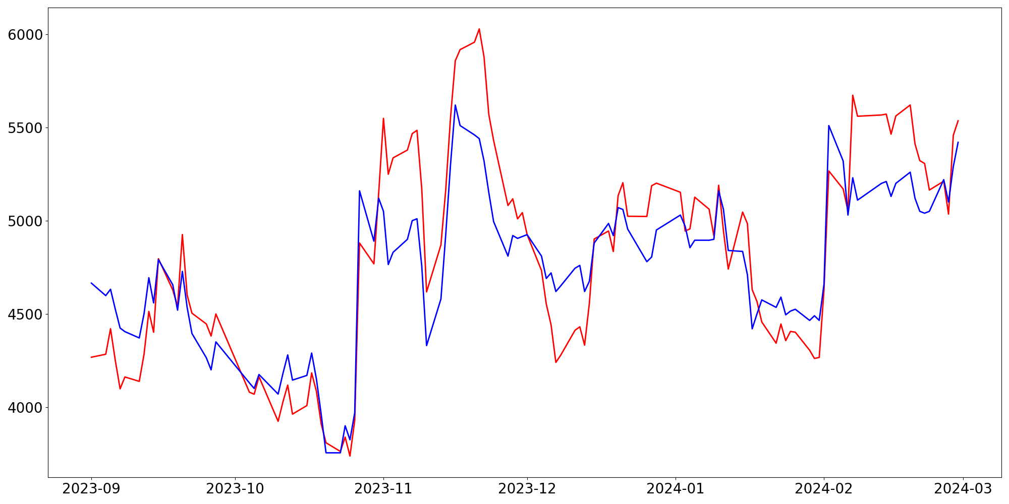 [ - : 실제값(종가) / - : 예측값(종가) ]