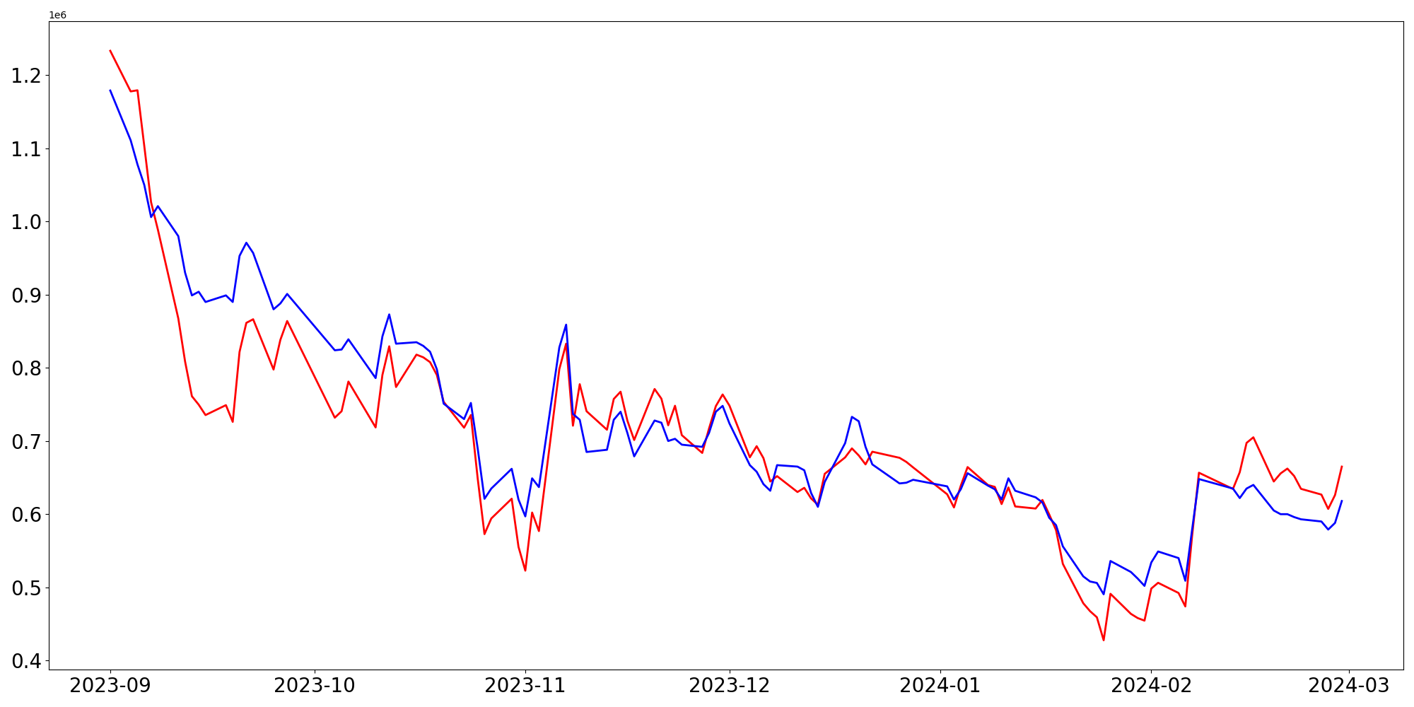 [ - : 실제값(종가) / - : 예측값(종가) ]