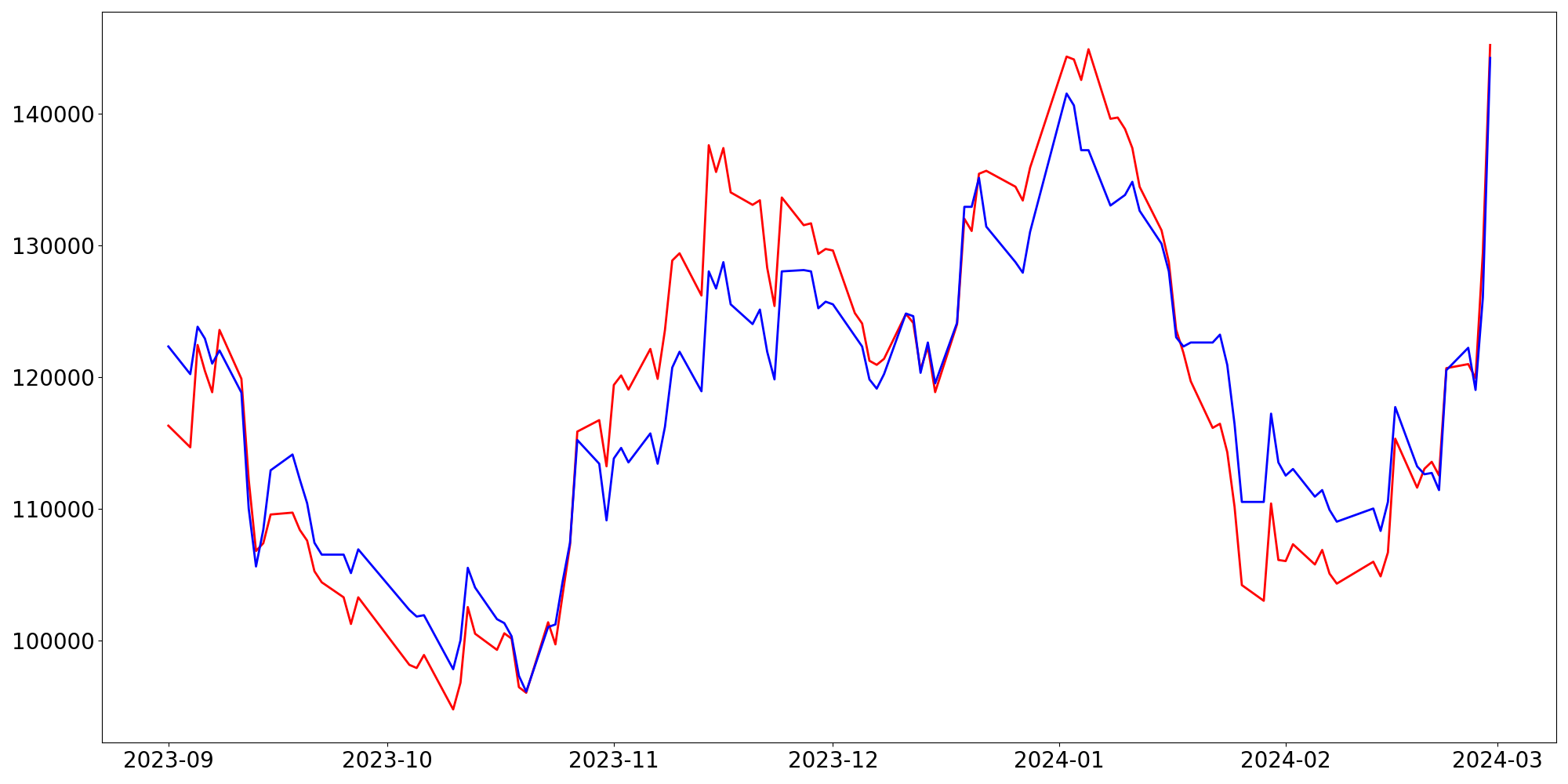 [ - : 실제값(종가) / - : 예측값(종가) ]