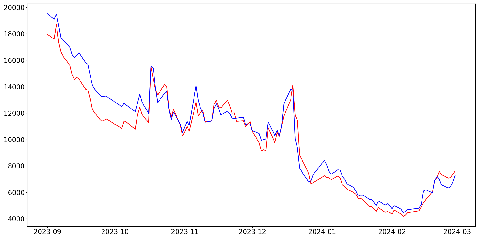 [ - : 실제값(종가) / - : 예측값(종가) ]