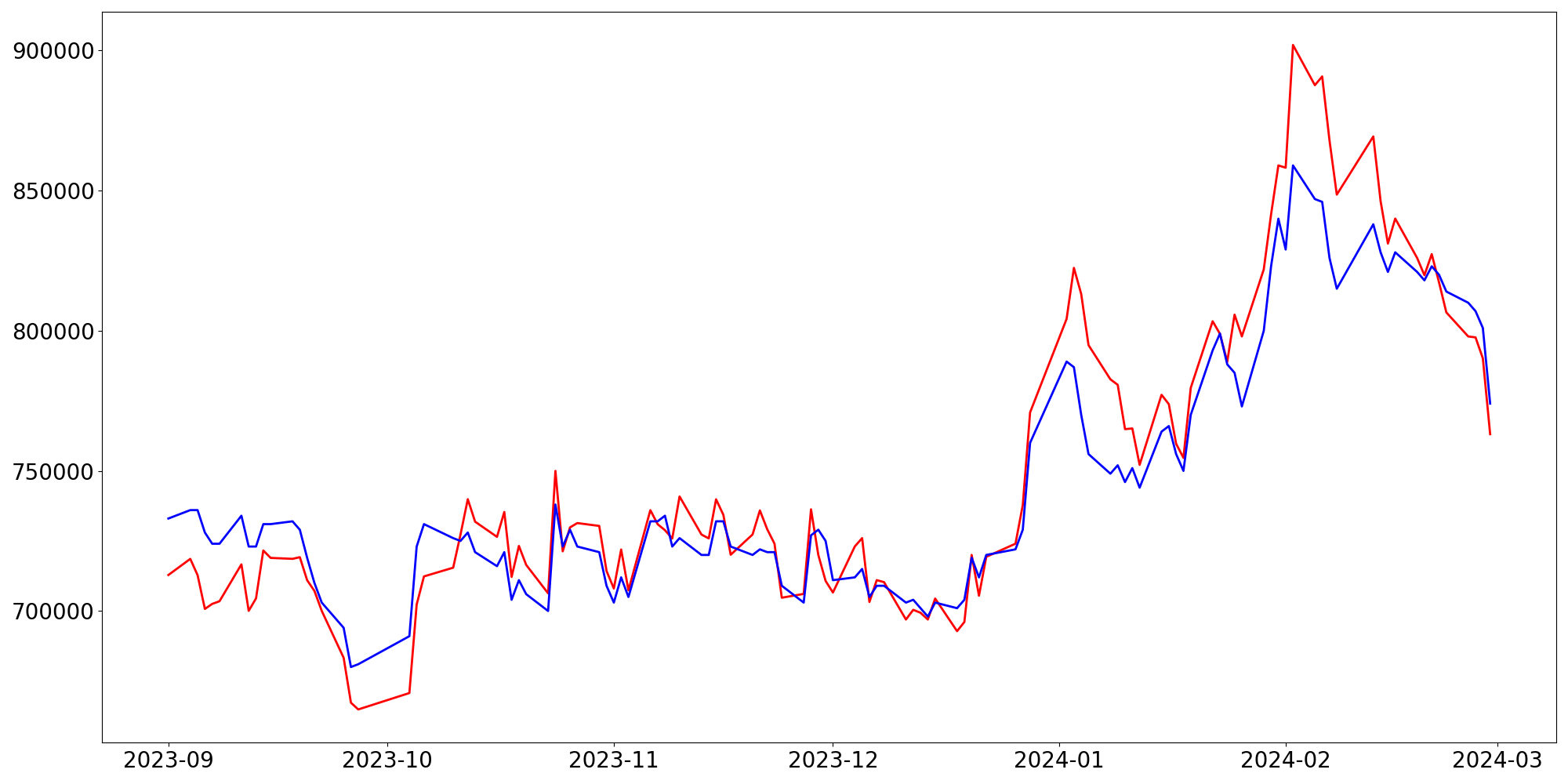 [ - : 실제값(종가) / - : 예측값(종가) ]