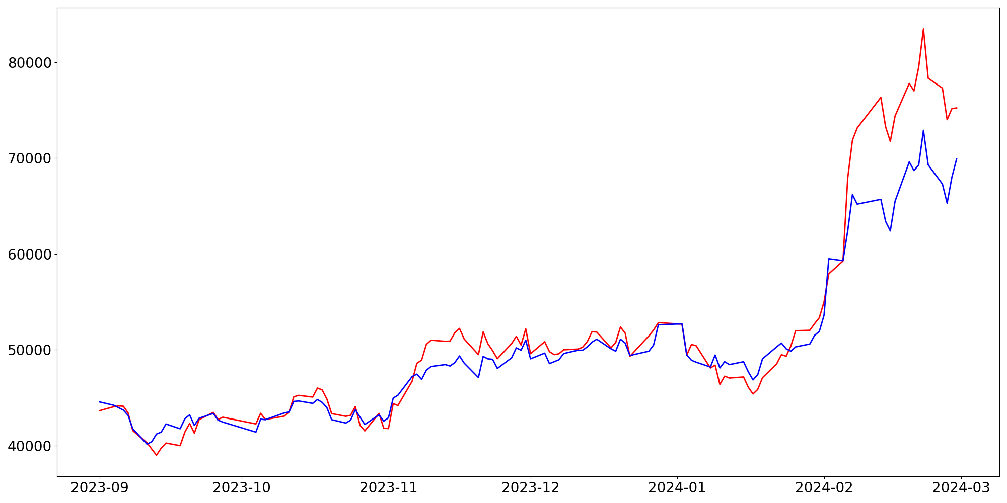 [ - : 실제값(종가) / - : 예측값(종가) ]