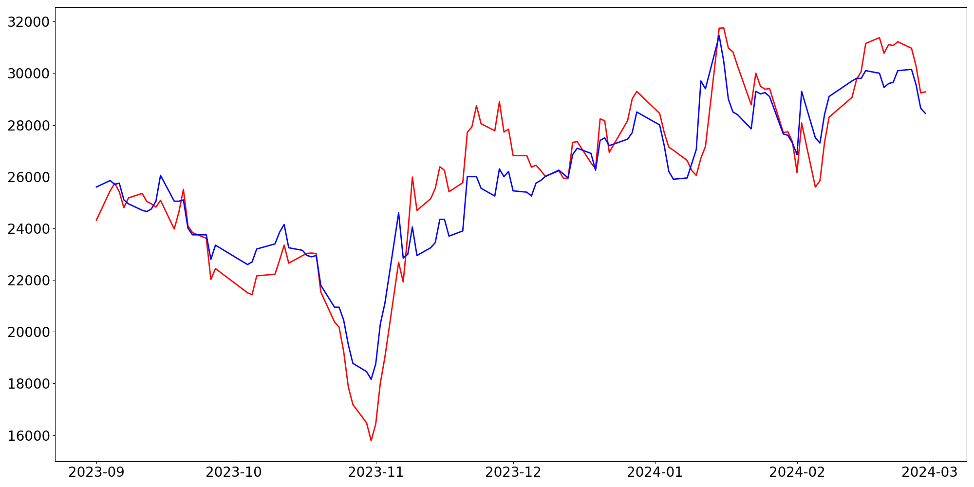 [ - : 실제값(종가) / - : 예측값(종가) ]