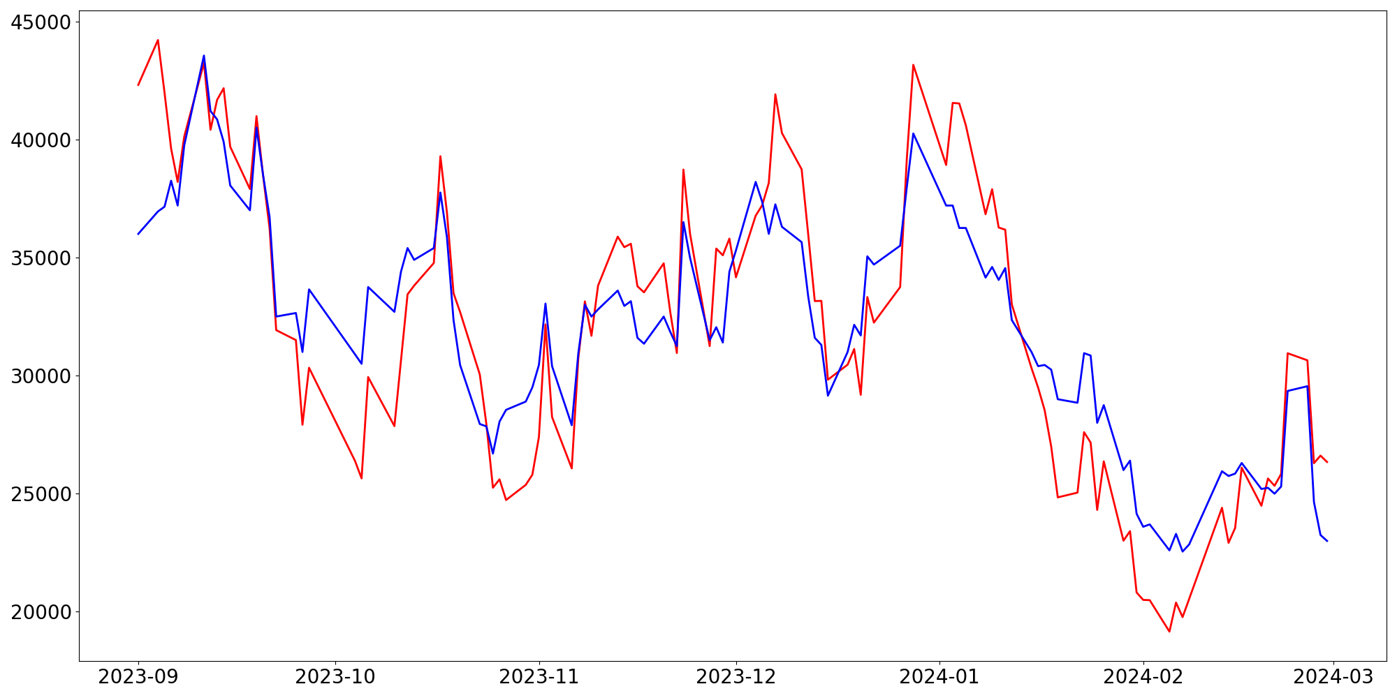 [ - : 실제값(종가) / - : 예측값(종가) ]