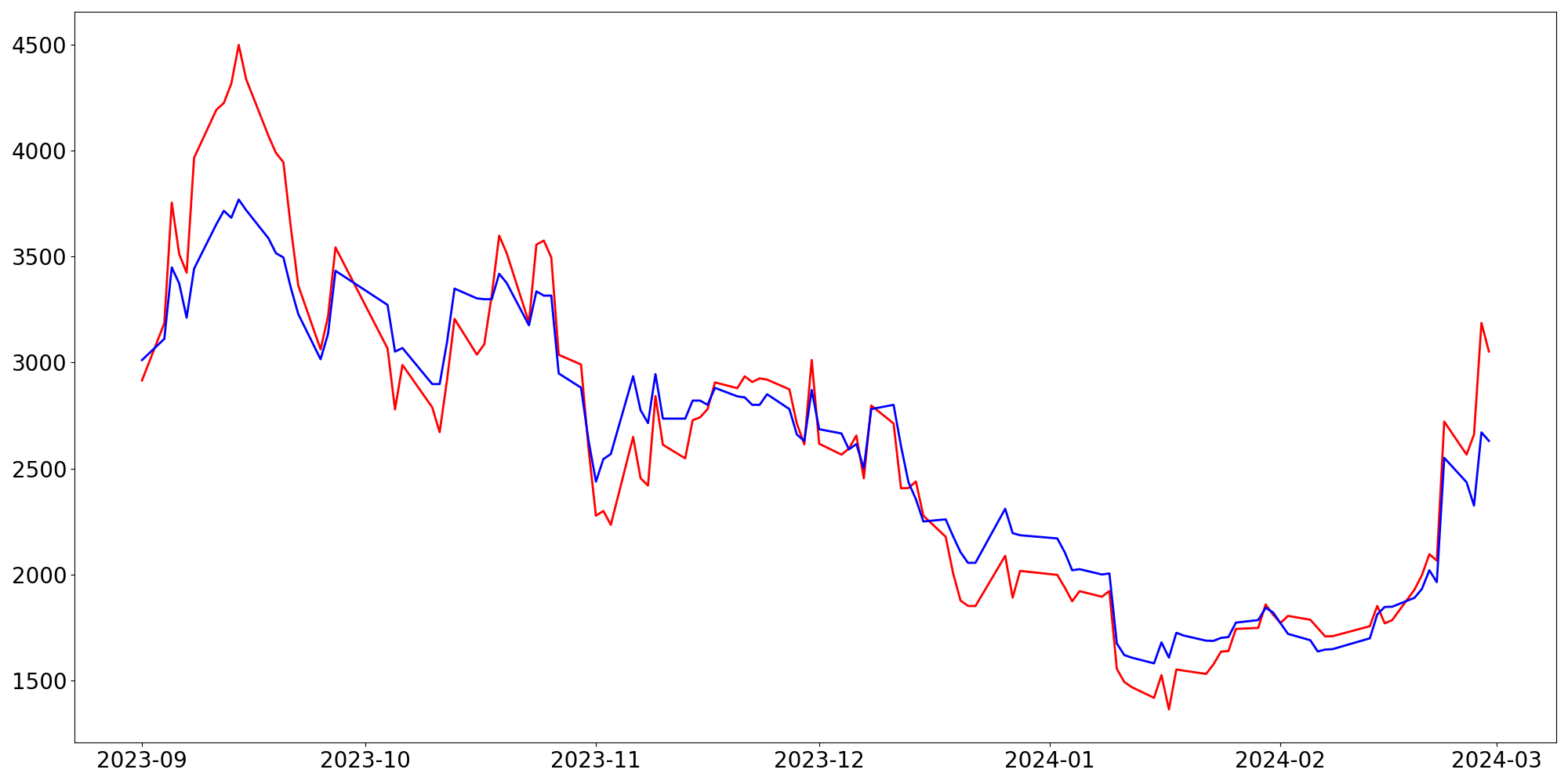 [ - : 실제값(종가) / - : 예측값(종가) ]