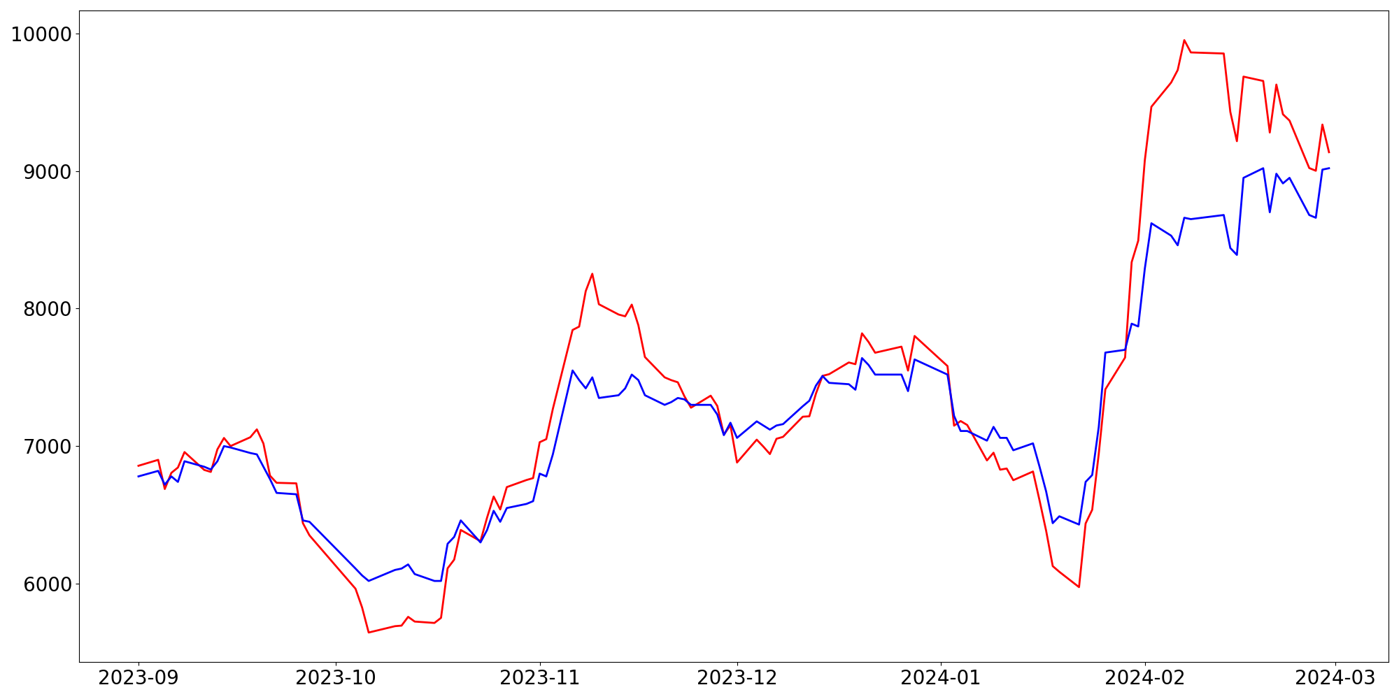 [ - : 실제값(종가) / - : 예측값(종가) ]