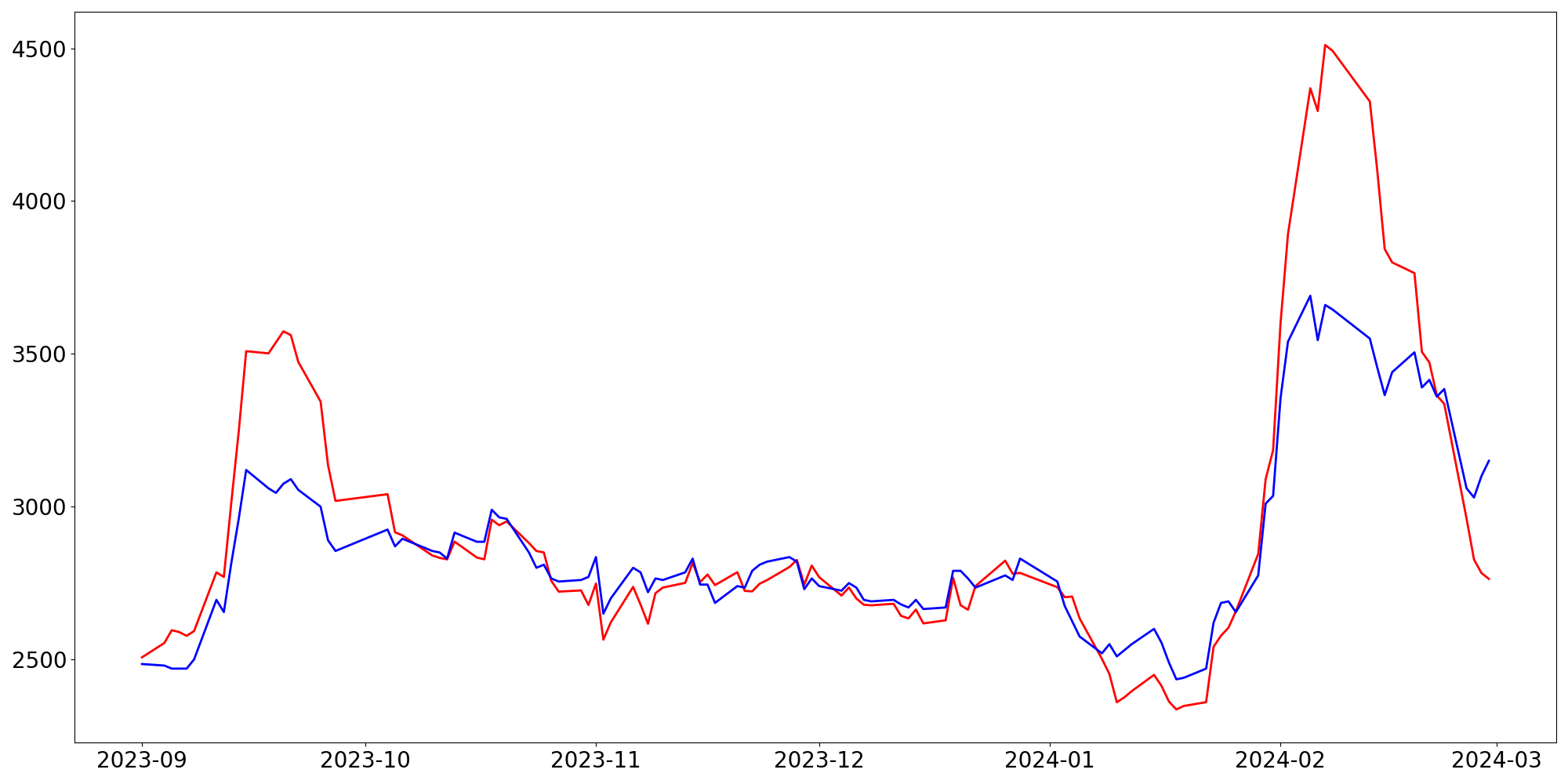 [ - : 실제값(종가) / - : 예측값(종가) ]