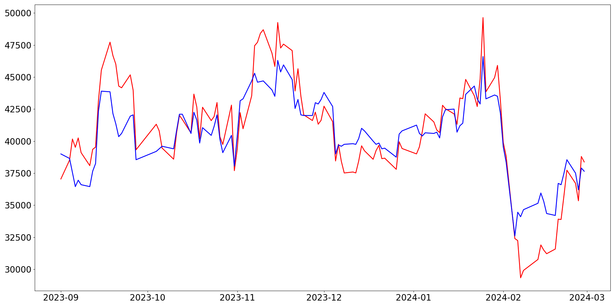 [ - : 실제값(종가) / - : 예측값(종가) ]