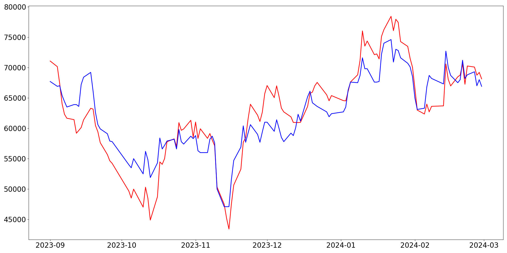 [ - : 실제값(종가) / - : 예측값(종가) ]