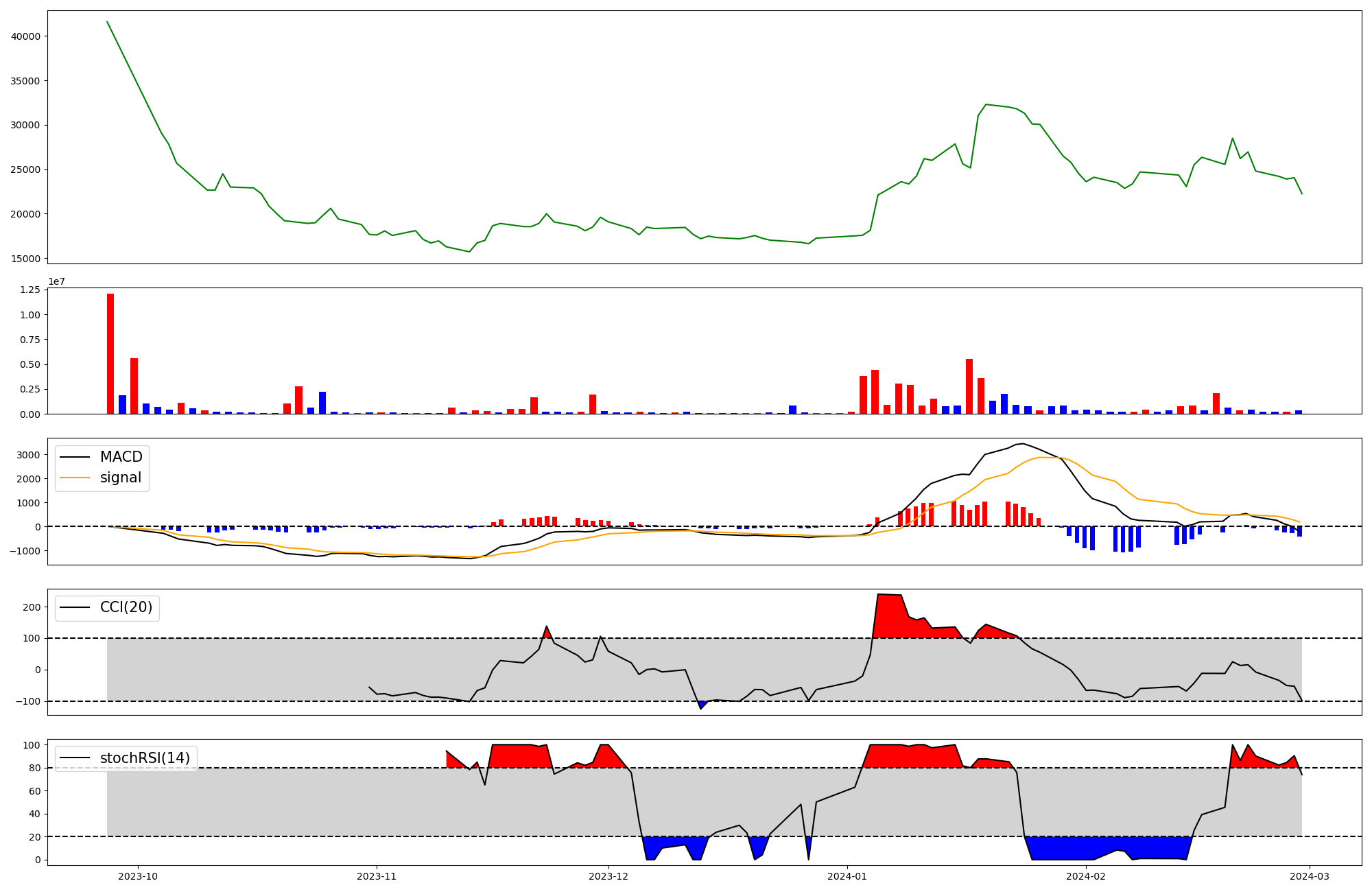□ 중기 : 현재 종가가 중기(60일) 이동평균값(22,930원)을 하회 하여 중기적 추세 하락 중