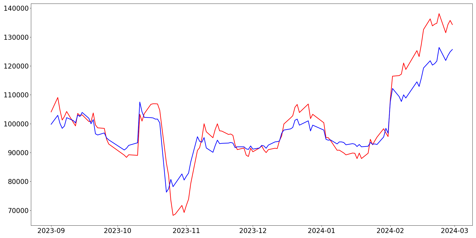 [ - : 실제값(종가) / - : 예측값(종가) ]